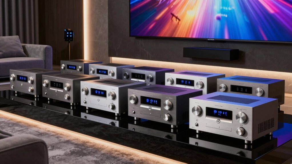 If you’re looking for the 15 best premium home theater receivers for 2026, I’ve got you covered. I focus on options with advanced audio tech like Dolby Atmos, DTS:X, and multi-channel support to create immersive sound. They also support 8K/4K pass-through, HDMI 2.1, and seamless smart home integration for future-proofing. To find out which receivers excel in performance, connectivity, and user experience, check out the next section.