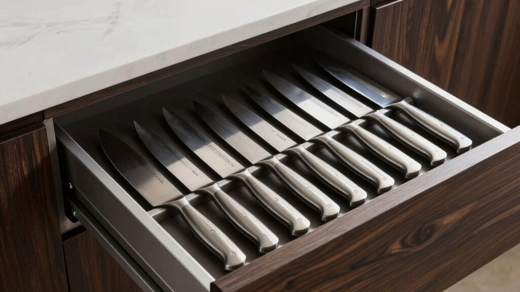 Choosing the right in-drawer knife organizer is like finding the perfect puzzle piece—it keeps everything snug, safe, and ready to use. Whether you prefer sleek bamboo, clever slots, or spacious compartments, there’s a perfect fit out there for you. With these options, your drawer will transform into a well-orchestrated symphony of blades, turning chaos into harmony. So, pick your champion and let your kitchen sing with safety and style!