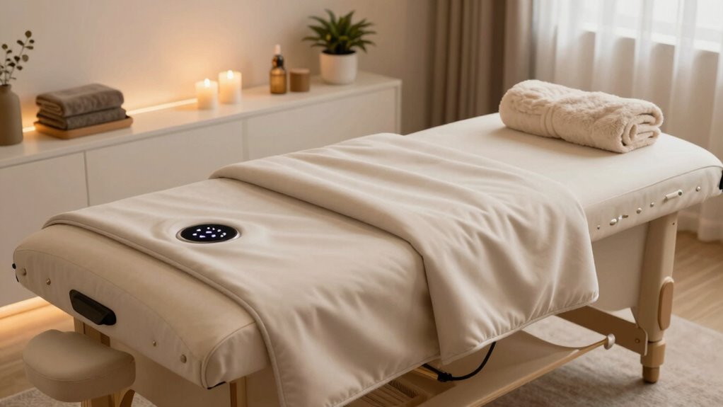 You might wonder if there are health risks with infrared sauna blankets, and I’ve found that, when used properly, they’re generally safe. However, I’ve noticed that overuse or high temperatures can cause dehydration or skin irritation. Always stay hydrated, follow manufacturer guidelines, and consult a healthcare professional if you have underlying health conditions. Staying cautious guarantees you enjoy the relaxation benefits without any surprises.