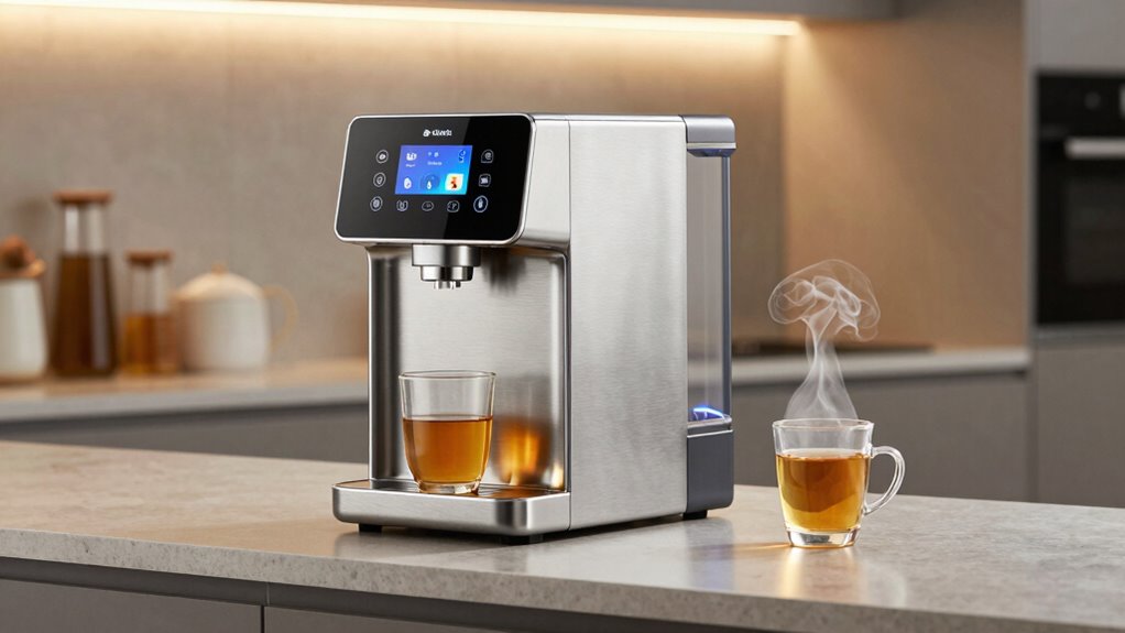 Matching the design of your instant hot water dispenser to your existing kitchen setup is essential for a seamless look and ideal functionality. You’ll want to guarantee the finish and style match your current fixtures for a cohesive appearance. Check if the dispenser fits your available space and mounting requirements, whether on the sink or counter. Consider the faucet’s height, spout length, and swivel range to ensure compatibility with your sink setup and daily use. Also, think about the dispenser’s aesthetic—whether modern, transitional, or traditional—to align with your overall kitchen decor. Finally, verify that the materials and finishes, like chrome or brushed nickel, are suitable for your environment, providing durability while maintaining your kitchen’s style.