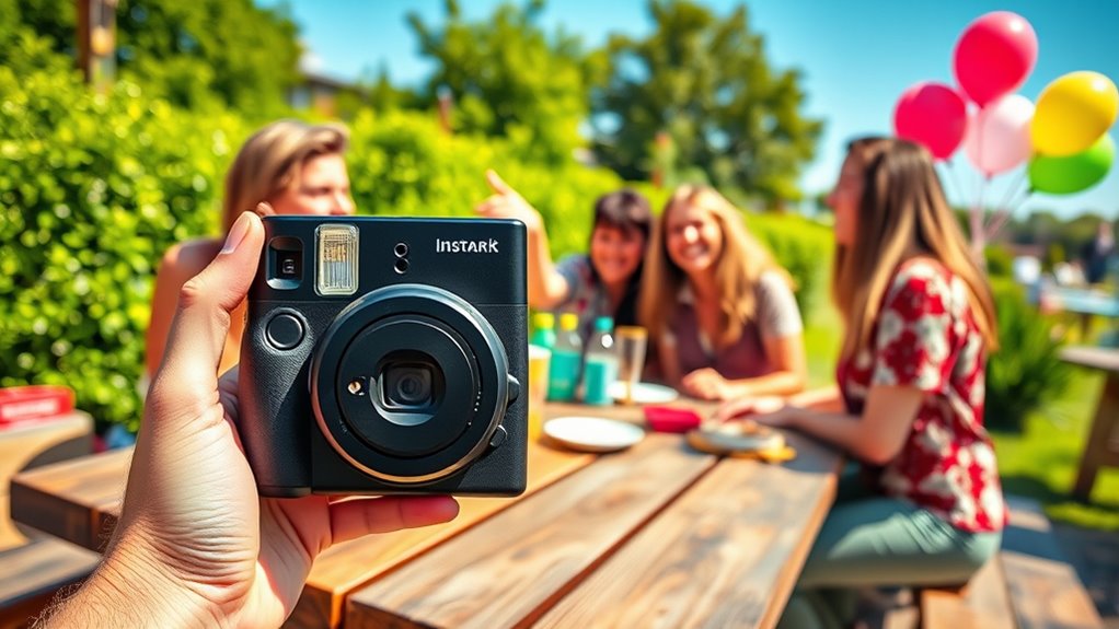 When choosing an instant photo camera, considering its compatibility options can make a big difference in how you use and enjoy your device. Some cameras connect via Bluetooth, Wi-Fi, or USB, allowing easy printing and sharing from smartphones and tablets. Wireless options like Bluetooth and Wi-Fi enable seamless printing and quick sharing without cables, while USB connections support charging and digital transfers, letting you print photos directly from your computer or mobile device. Additionally, many cameras now support mobile apps that enhance editing, filtering, and customization, giving you more creative control. Some models are designed to work exclusively with proprietary film formats, but others support multiple film types or digital file transfers. Choosing the right compatibility features guarantees you get the most flexibility and convenience for your photo adventures.