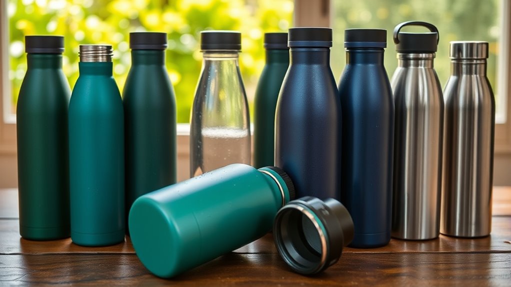 The insulation effectiveness of a water bottle largely depends on the type of insulation it uses, with double-wall vacuum insulation being the most efficient for maintaining temperature. This design creates a barrier that considerably reduces heat transfer, keeping drinks cold for up to 24 hours or hot for up to 12 hours. Thicker walls and vacuum seals are essential, as they minimize heat exchange and enhance performance. Materials like stainless steel with vacuum insulation outperform plastic or non-insulated bottles in thermal retention. Additionally, the lid and sealing mechanisms are critical, as they prevent heat from escaping or entering, helping your beverage stay at the desired temperature longer. Overall, choosing a bottle with high-quality insulation ensures your drinks stay fresh throughout the day.