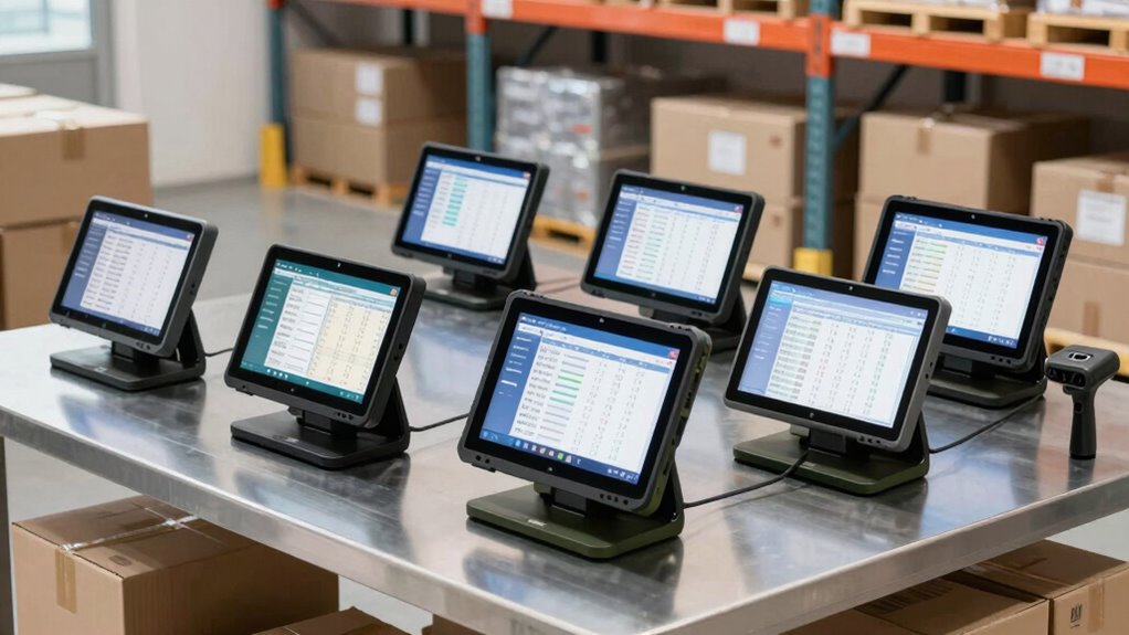 Ever wondered how ruggedness ratings really impact a tablet’s durability? They’re vital because higher ratings, like IP67 or MIL-STD-810, mean the device can withstand drops, dust, and water better. In warehouse settings, this means fewer repairs and less downtime. I’ve found that choosing a tablet with a solid ruggedness rating guarantees it endures harsh environments, saving money and hassle in the long run. Wouldn’t you agree it’s worth investing in durability?