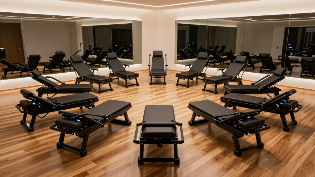 Safety features are essential to guarantee that inversion therapy remains secure and effective. I look for tables with secure ankle locking systems and adjustable safety belts to prevent slips and keep me stable during inversion. Protective covers on adjustable pins give me confidence that I won’t pinch myself or get injured while changing positions. Clear indicators for multi-position adjustments help me set the right angle safely within my comfort zone. Additionally, folding and space-saving designs not only make storage easier but also reduce hazards when I’m not using the table. Certification standards like UL safety approval or FDA registration assure me that the product meets recognized safety guidelines. Prioritizing these features ensures my inversion sessions are both safe and beneficial.