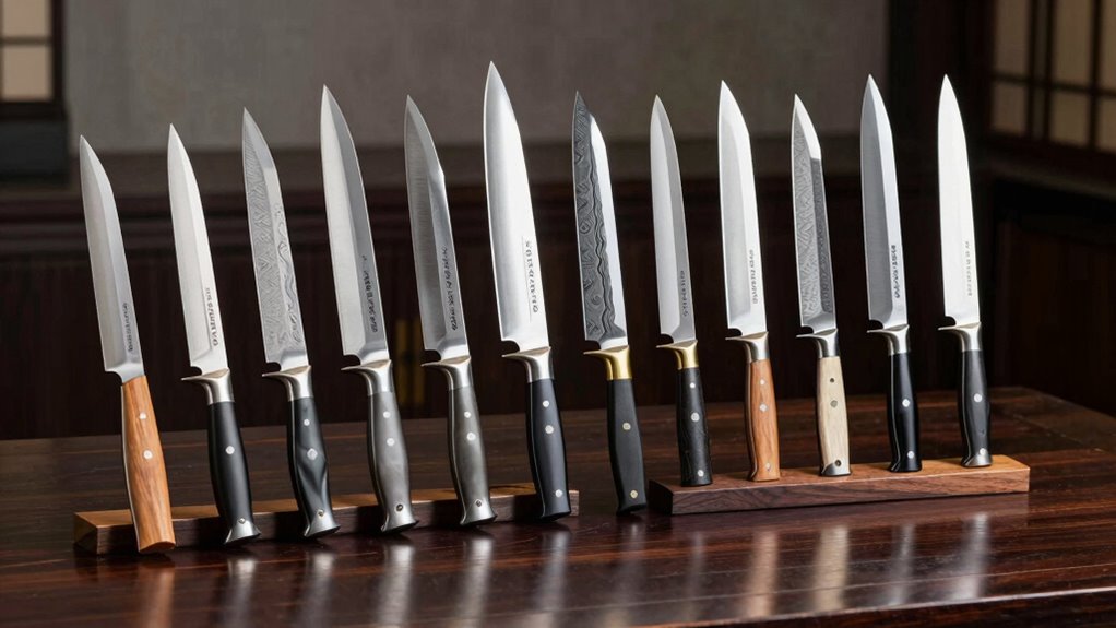 Blade sharpness and edge quality directly impact how well a Japanese knife performs and how long it stays sharp. Japanese knives are typically sharpened to a 15° or 16° angle, creating an incredibly sharp edge perfect for precise slicing. High-quality blades often undergo multiple layers of forging, which boost both durability and edge retention. Advanced heat treatments, like vacuum cold nitrogen, further harden the steel, ensuring the edge remains sharp longer. Many knives feature laser sharpening with either double-bevel or single-bevel designs, providing consistent, clean cuts and easier resharpening. To keep these blades performing at their best, regular honing and proper maintenance are essential. A well-maintained, sharp edge makes all the difference in achieving effortless, precise cuts in your kitchen.