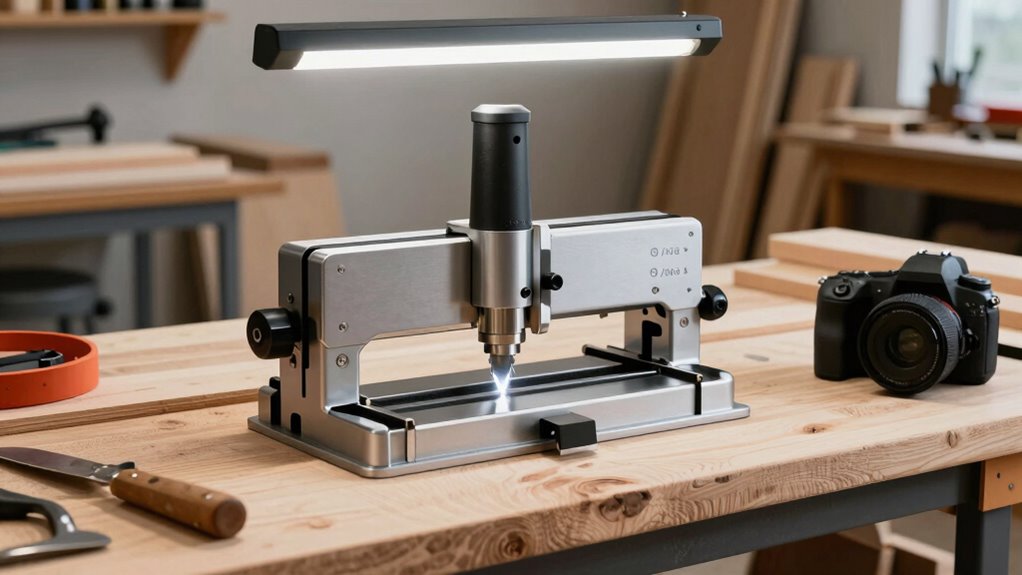 Safety features are crucial when selecting a jointer, as they help prevent accidents and guarantee a secure working environment. I look for models with lockable switches to prevent accidental startups during maintenance or when the machine is unattended. Blade guards, whether spring-loaded or covers, are essential to protect my hands from direct contact with the blades. Emergency stop buttons allow me to shut down the machine quickly if needed. Adjustable fences and safety stops help maintain proper positioning, reducing the risk of kickback or slips. I also pay attention to safety certifications and compliance with industry standards, ensuring the jointer meets important safety requirements. Prioritizing these features gives me confidence to work efficiently while minimizing hazards.