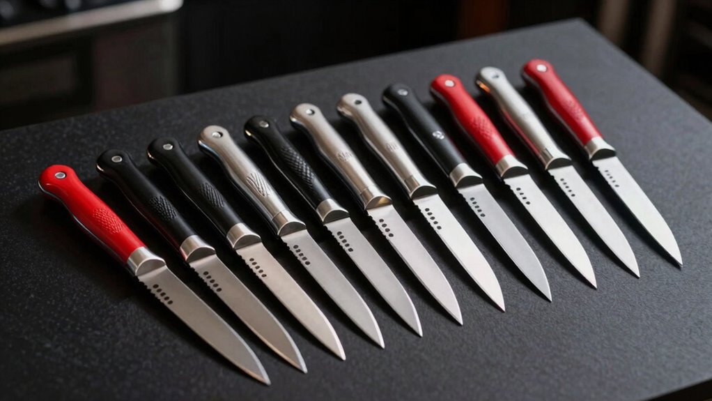 When selecting knives for precision cutting, I focus on blade sharpness and type to guarantee clean, accurate cuts. I also consider handle ergonomics and grip for comfort during extended use, along with material durability to assure longevity. Ultimately, safety features and easy blade replacement are vital for both safety and convenience.