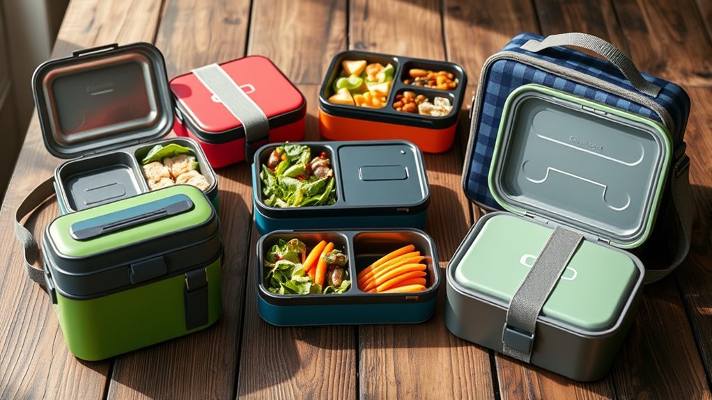 If you’re searching for the perfect lunch box that balances style and functionality, I’ve got some great options to explore. From sleek insulated bags and versatile Bento boxes to rugged coolers and expandable designs, there’s something for every need—whether you’re at work, outdoors, or on the go. These choices feature leak-proof compartments, durable materials, and stylish looks that keep your food fresh and your look sharp. Keep going, and you’ll discover the top picks that match your lifestyle.