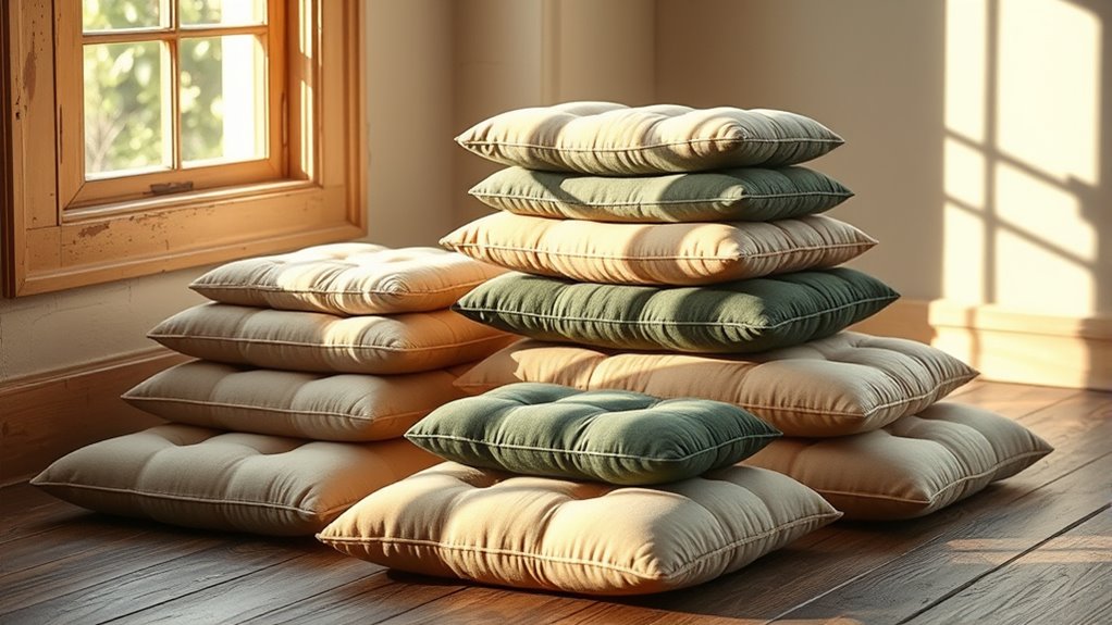 Cushion fillings directly impact comfort and support by shaping how well I can sit for extended periods. Firmer fillings like buckwheat or foam provide stable support, reducing pressure points, while softer fillings like kapok or wool offer plush comfort. I prefer a balance—something that molds to my body without sacrificing support—so I stay comfortable and focused during meditation. Choosing the right filling truly enhances my practice.