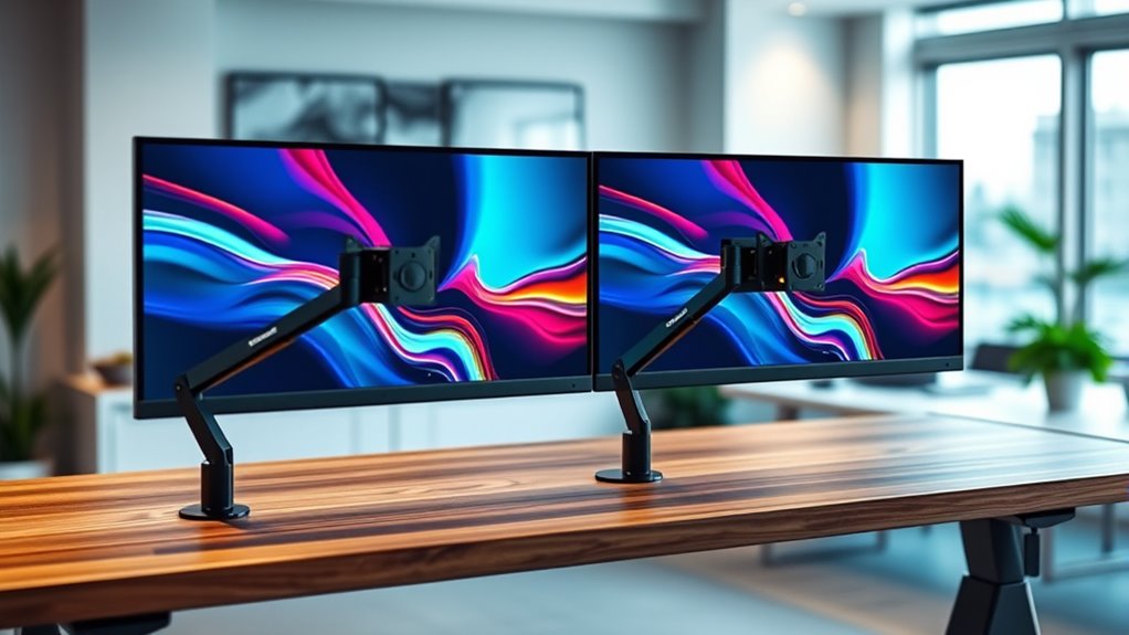 Maximizing desk space is a key benefit of choosing dual monitor arms, as they elevate screens above the surface and free up valuable workspace. These arms allow monitors to be positioned closer or farther from your eyes, optimizing your desk area. Many models include integrated cable management systems, reducing clutter and keeping cords organized. Full-motion arms enable swiveling, tilting, and rotating, so you can adjust screens for perfect positioning while conserving space. Mounting options like clamp or grommet bases securely attach to various desk types, eliminating bulky stands and freeing up surface area. By leveraging these space-saving features, you create a cleaner, more efficient workspace that adapts to your needs, making dual monitor arms an essential upgrade for maximizing your desk real estate.