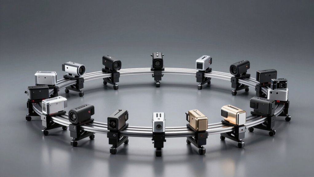 Choosing the right shooting modes on a motorized slider can dramatically enhance your product shots by offering greater versatility and control. Different sliders support modes like time-lapse, panoramic, tracking, and manual, giving you options to craft unique visuals. Some models feature automatic round-trip or bidirectional movement, perfect for looping footage that highlights product features dynamically. Adjustable speed and dwell time settings let you fine-tune shot timing and ensure smooth motion. The availability of vertical, horizontal, and slant shot modes expands your creative possibilities, letting you showcase products from various angles. Compatibility with apps or remote controls simplifies switching between modes and customizing movements, saving time and effort. Overall, diverse shooting modes are key to capturing professional, engaging product shots efficiently.