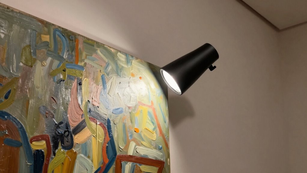 Adjustable color temperatures give you the flexibility to tailor the lighting ambiance to best showcase each artwork. They typically range from warm white (2700K) to cool white (6500K), allowing you to highlight warm tones or emphasize cooler shades as needed. This feature helps improve the artwork’s appearance by enhancing color accuracy and fidelity, ensuring it looks as intended under different lighting conditions. Being able to switch between multiple color modes also helps prevent glare and reduces eye strain for viewers and curators alike. Some lights even offer seamless shifts, enabling precise adjustments to match the artwork’s medium, frame, or viewing environment. Overall, adjustable color temperatures provide essential control, making your display more vibrant, accurate, and viewer-friendly.