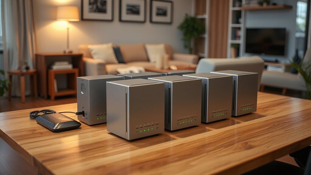 The performance capacity of a home network firewall determines how well it can handle the data traffic generated by multiple devices and demanding applications. Key factors include firewall throughput, which measures the maximum data transfer rate without slowing down your network. Concurrent connection limits are also crucial, as they indicate how many sessions the device can manage simultaneously, especially during peak usage. The number of high-speed LAN ports, like 2.5GbE or gigabit ports, impacts the overall capacity to support multiple devices and high-bandwidth activities. Additionally, the device’s CPU and RAM directly affect its ability to process complex security functions such as deep packet inspection and VPN encryption without latency. Hardware features like NPUs and optimized architecture help help guarantee stable performance under heavy traffic loads.