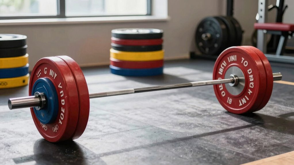 When deciding between bumper and cast iron plates for your Olympic set, it’s important to contemplate how each type performs during your workouts. Bumper plates, made of rubber or urethane, absorb impact and reduce noise when dropped, making them ideal for Olympic lifts and high-impact training. They also have a uniform diameter, which promotes safer, more consistent lifts. Cast iron plates, on the other hand, are more durable and usually less expensive, but they produce more noise and can chip or rust without proper care. Their size varies with weight, affecting balance and handling. If your focus is dynamic lifts and drop safety, bumpers are a smart choice. For traditional strength routines and cost-effectiveness, cast iron plates work well, especially in a home gym setting.