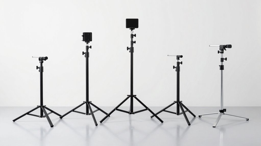 When selecting an overhead camera stand for product demos under $700, ease of assembly should be a top priority, as it directly affects setup time and usability. Look for stands with quick-release clamps and telescoping arms, which allow for faster adjustments. Modular components and tool-free assembly minimize the need for extra tools or complex instructions, saving valuable time. Adjustable height and arm length should be straightforward to change via simple knobs or quick-lock mechanisms, enabling smooth transitions between different demo setups. Clear measurement scales or indicators help guarantee precise adjustments, reducing guesswork. A stable, sturdy base with ergonomic handles makes transporting and repositioning easier without sacrificing stability. Prioritizing these features ensures a seamless setup process, letting you focus on your product demos rather than wrestling with equipment.