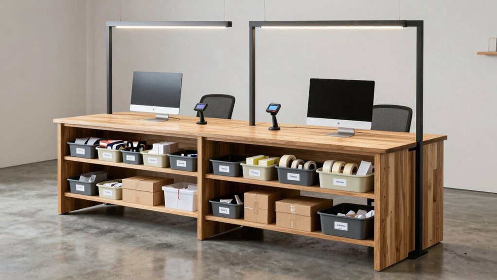 Evaluating storage capacity and flexibility is essential when selecting a packing workstation with shelves under $1200. I look at the number and size of shelves to guarantee they meet my specific needs for tools, materials, and supplies. Adjustable shelves are critical, as they allow me to reposition them for different item heights, boosting organization. I also consider the total storage capacity, both in volume and weight limits, to avoid overloading and maintain durability. Modular or expandable shelving options are a plus, offering flexibility as my storage needs change. Ultimately, I prioritize designs that provide easy access and clear visibility, which help streamline workflow and improve safety. These factors guarantee I get a workstation that adapts to my evolving packing requirements without compromising space or efficiency.
