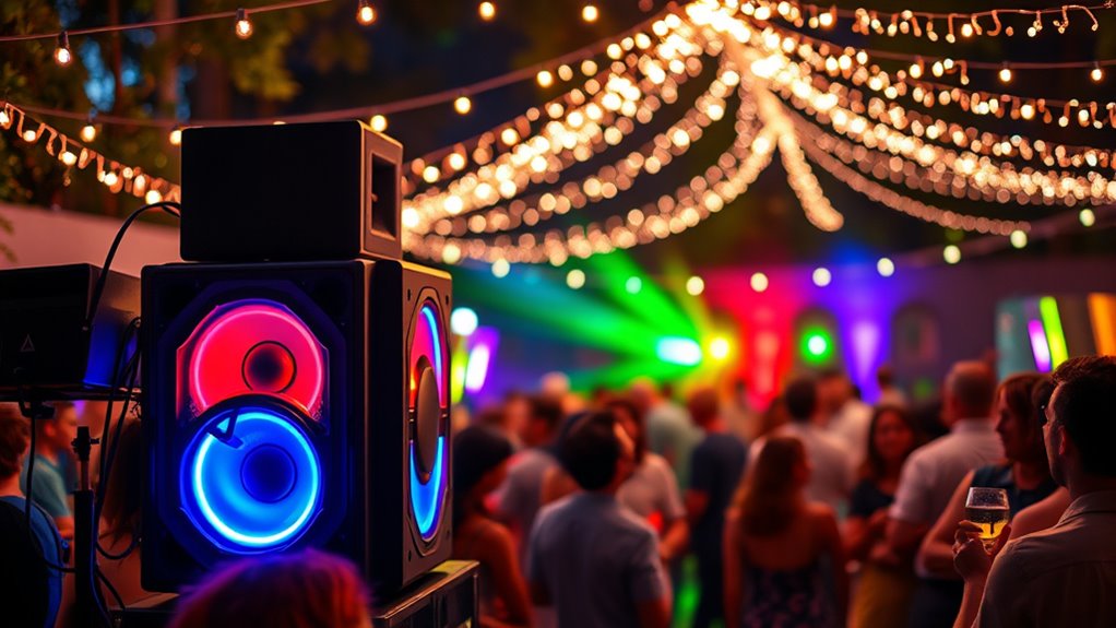 Lighting synchronization features elevate your party experience by creating a vibrant atmosphere that moves in perfect harmony with the music. I look for speakers that automatically match light effects to the beat, making every moment more dynamic. Customizable light modes or colors allow me to tailor the visuals to match my event’s theme or mood, adding a personal touch. Remote control options, whether through an app or physical controls, make it easy to adjust lighting on the fly without interrupting the vibe. I also check if the lights can sync with external devices or additional fixtures, offering an expanded, immersive light show. Features like strobe, pulsing, or color-changing modes further enhance the atmosphere, ensuring my party looks as lively as it sounds.