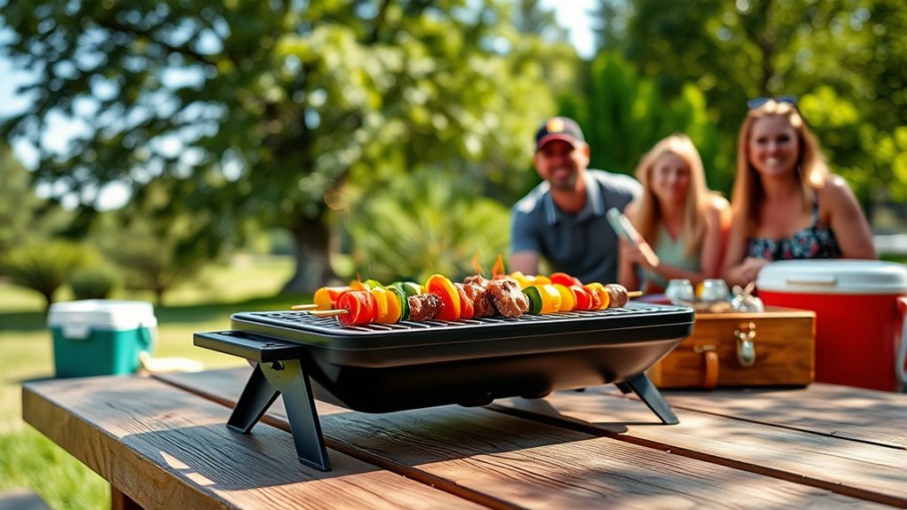 Choosing the right portable grill is like finding the perfect dance partner—once you do, outdoor cooking becomes effortless and enjoyable. I remember my first camping trip, fumbling with bulky gear until I found a compact grill that felt just right—like a trusted buddy. With options ranging from charcoal to propane, you’ll discover your ideal match. So go ahead, pick one, and let your culinary adventures under the open sky begin—where every meal is a celebration.
