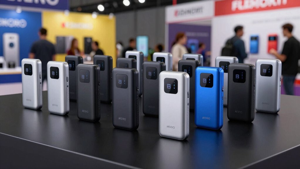 A reliable portable hotspot needs a battery that can keep up with long trade show days, so you won’t have to worry about constant recharging. Look for devices with at least 8-12 hours of battery life to guarantee steady connectivity throughout your event. Fast charging via USB-C is a big plus, allowing quick recharges during short breaks, reducing downtime. A high-capacity battery, like 3000mAh or more, is vital in environments with limited power outlets. Some hotspots feature battery indicator displays, so you can easily monitor remaining charge and plan charging schedules. For added flexibility, external power banks can extend usage, especially when built-in batteries run low. Prioritizing these features helps maintain reliable internet access without interruptions during your busiest days.