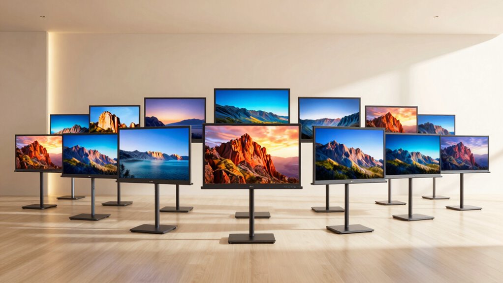 Portability and weight are crucial factors to contemplate if you want a portable projector screen that’s easy to transport and set up. A lightweight screen, usually under 15 pounds, makes carrying and positioning effortless, especially for outdoor or on-the-go use. Foldable designs add to convenience by allowing the screen to be compactly stored in included carrying bags or cases. Materials like aluminum or high-grade polyester strike a good balance between durability and weight, ensuring sturdiness without bulk. Quick-assembly features, such as tool-free setup and adjustable stands, further enhance portability by reducing setup time. Compact dimensions and foldable frames enable the screen to fit into standard car trunks or backpacks, making it simple to carry around for presentations, outdoor movie nights, or travel.