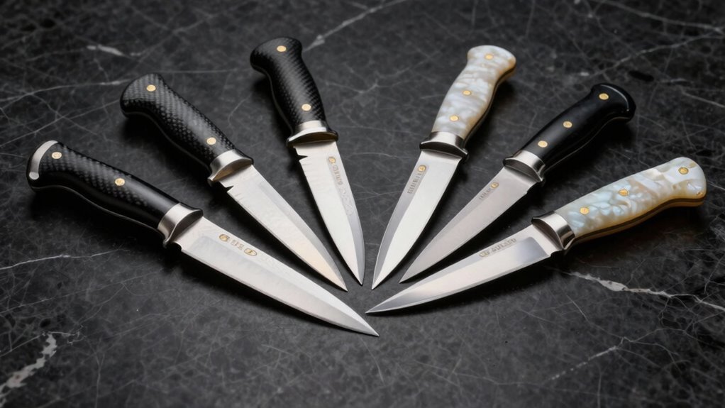 High-quality steel is the foundation of premium knives over $500, and understanding the materials involved can make a significant difference in your choice. These knives typically feature advanced steels like VG-10, SG2, or CPM S90V, which offer excellent edge retention and corrosion resistance. Many incorporate multiple layers of Damascus steel, boosting durability and adding visual appeal through complex forging techniques. Cryogenically treated and vacuum-hardened steels achieve a hardness rating between 58 and 67 HRC, ensuring the blade stays sharp longer. Specialized coatings like titanium nitride further enhance surface hardness and reduce friction during use. The steel’s high carbon content and alloying elements are vital, as they directly influence how easy the knife is to sharpen and its overall wear resistance. Choosing the right blade material truly impacts performance and longevity.
