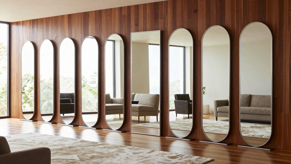 A professional floor mirror offers remarkable flexibility in placement, making it essential to contemplate how it will fit into your space. Whether you prefer positioning it on the floor, leaning against a wall, or mounting it, these options suit various room layouts and space constraints. Adjustable features like tilt or stand options let you customize angles for better viewing, enhancing usability. Multi-installation choices, from wall mounting to freestanding setups, allow seamless integration into different interior styles and functional needs. The ability to easily move and reposition the mirror supports changing room arrangements or multi-purpose uses, making it adaptable for bedrooms, gyms, or retail spaces. Opting for a mirror with versatile placement options ensures it remains functional and stylish, no matter your evolving needs.