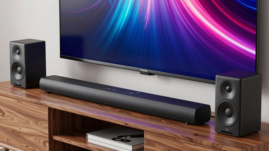 Advanced audio processing technologies play a essential role in delivering professional-quality sound from a soundbar. Digital Signal Processing (DSP) enhances clarity, balance, and surround effects by manipulating audio signals in real-time. Technologies like Dolby Atmos and DTS:X create immersive, multidimensional soundscapes that add height and spatial cues, elevating the listening experience. Voice enhancement algorithms are pivotal for isolating and amplifying dialogue, making speech clearer even in noisy environments. Customizable sound profiles and equalizer presets allow precise tuning of treble, midrange, and bass, adapting sound to different content and room acoustics. Additionally, signal-to-noise ratio and dynamic range processing minimize background noise and distortion, ensuring the sound remains natural and clear. These technologies are essential factors to think about for professional-grade sound quality.