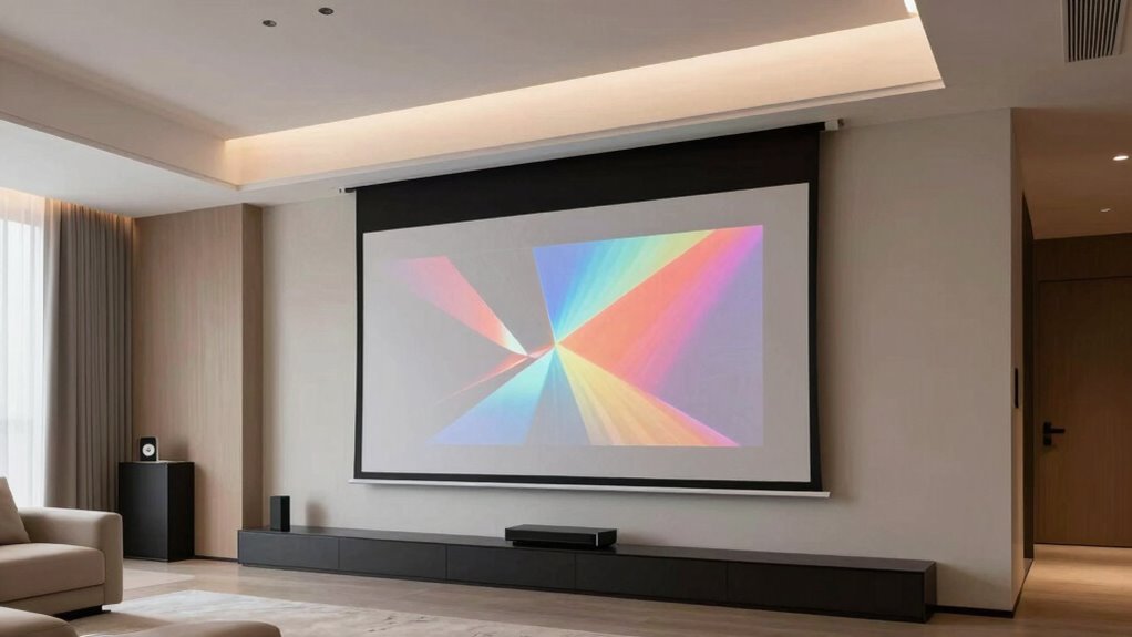 Ever wonder how noisy your projector screen might be? I’ve found that noise levels vary quite a bit among models. Some operate whisper-quiet with barely a hum, while others produce noticeable sounds during operation. Higher-end screens often feature advanced motors designed for silent retraction, making your movie night peaceful. So, if quiet is your priority, look for screens with low decibel ratings—your ears will thank you.