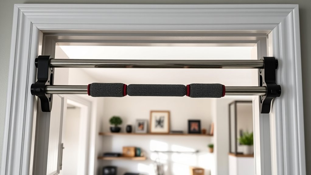 Since door frame protection is essential for maintaining your home’s integrity, I always look for pull-up bars that include silicone or foam padding at contact points. These pads prevent scratches, dents, and paint peeling, especially on delicate or older doorframes. I prefer bars with double silicone contact points or no-trace pads, which keep the frame unmarked after use. Adjustable padding and reinforced contact areas are also important, as they evenly distribute pressure and minimize damage during high-force exercises. Regularly inspecting and maintaining the protective padding guarantees long-term safety and prevents wear over time. Ultimately, a well-designed pull-up bar with quality door frame protection helps preserve my home’s condition while still providing a solid workout.