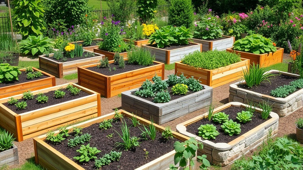 If you’re looking for the best raised garden beds for a successful, low-maintenance garden in 2025, I recommend considering weather-resistant materials like galvanized steel and durable wood options such as cedar or Chinese fir. Sizes vary from compact to large, perfect for patios or expansive yards, and many feature built-in drainage and portability. Easy assembly and stability are key. Keep exploring to find detailed options that fit your space and needs for a bountiful harvest.