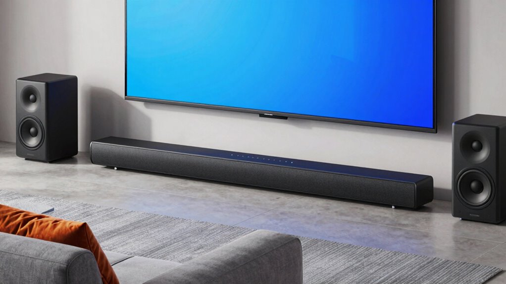Choosing the right soundbar is like finding the perfect tune to set your home’s vibe. With so many top-rated options, you can transform your living space into a concert hall or cozy cinema. Just remember to evaluate your space, budget, and sound preferences. When you pick the right one, every scene becomes a symphony, and your home feels alive with rich, immersive audio. Your perfect soundscape is just a decision away.