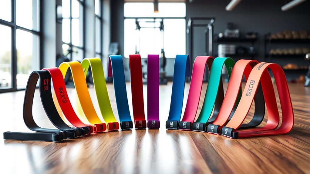 To get the most out of your resistance bands, it’s important to make certain they suit your specific workout routines. First, check if the bands align with your exercises, whether that’s strength training, yoga, or physical therapy. Look for adjustable resistance levels or stacking options to match your desired intensity. Make sure the bands’ length, width, and resistance range support your target muscle groups and movement types. The material and design also matter; choose latex, fabric, or TPE based on skin sensitivity and your workout environment. Additionally, consider accessories like handles, door anchors, or ankle straps to increase versatility. Ensuring compatibility with your exercise style helps maximize effectiveness and comfort, making your workouts safer and more enjoyable.