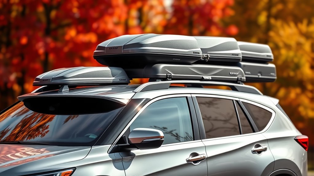 If you’re looking for the best roof cargo boxes to add extra storage, I’ve found some top-rated options like the Thule Pulse, SportRack Vista XL, and Yakima SkyBox NX XL. These models vary in capacity, design, and weather resistance, making them great for outdoor gear, luggage, or camping equipment. They’re compatible with most roof racks and include security features. Keep exploring to find the perfect fit for your vehicle and adventure needs.