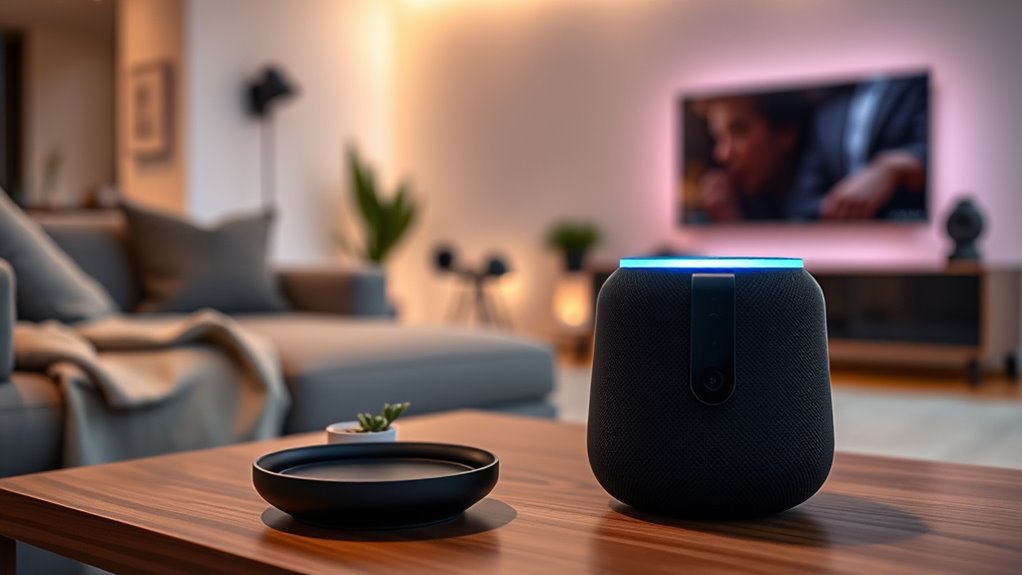 Ever wonder how well your smart speaker will fit into your existing smart home setup? When choosing an Alexa-enabled device, I look for support for protocols like Zigbee, Matter, or Thread, which guarantee smooth integration with various smart devices. I also consider whether the speaker has a built-in smart home hub or works with external hubs, making it easier to control multiple brands from one app. Compatibility with my existing smart home ecosystem and automation routines is vital for centralized control. Additionally, features like Amazon Sidewalk and eero Built-in are important for extending Wi-Fi coverage, especially in larger spaces. Finally, I check if the device supports multiple standards, ensuring my setup remains flexible and ready for future expansion.