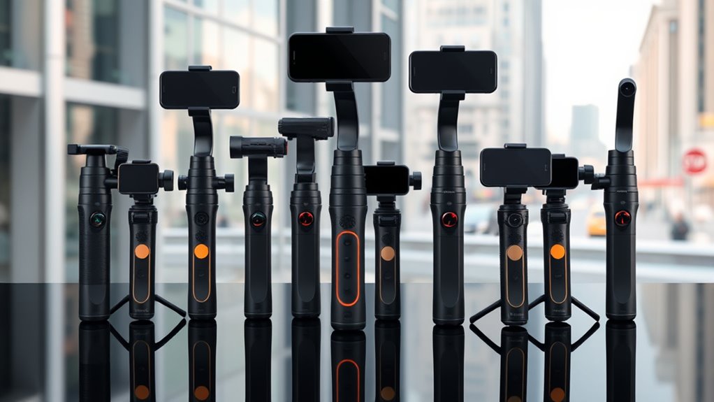 If you’re looking for the best smartphone gimbals in 2025 to achieve smooth, professional shots, I recommend models like DJI Osmo Mobile 7 and 7P for their advanced stabilization, portability, and creative features. Brands like Hohem and AOCHUAN offer reliable, durable options with AI tracking and built-in lighting. These gimbals are compatible with most phones and packed with modes for cinematic filming. Keep exploring to discover which one suits your needs perfectly.