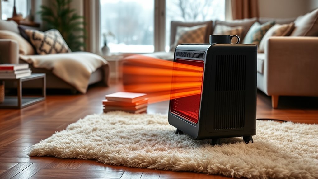 Safety features are the backbone of cost-effective heater use, keeping accidents at bay. I look for units with tip-over switches, automatic shut-off, and overheat protection — these act like a safety net, preventing costly damage or injuries. Programmable thermostats also help conserve energy by maintaining a steady temperature. When your heater has these features, you’re not just cozy, but also confident that it’s working safely and efficiently.