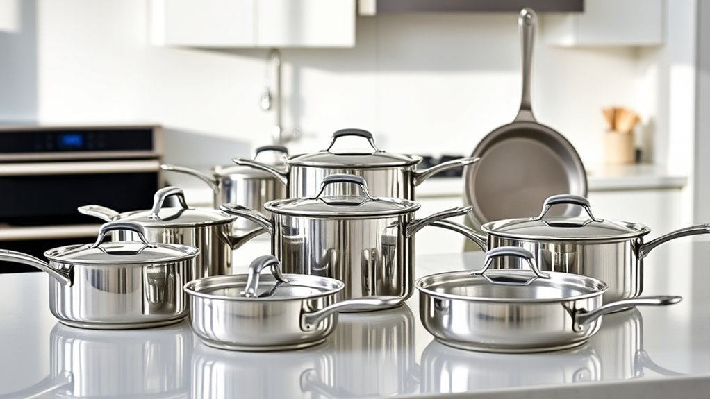 Choosing the right stainless steel cookware means paying close attention to its material layers, as these directly influence performance and durability. Many high-quality sets feature multi-layer constructions like tri-ply or five-ply, with aluminum or copper cores wrapped in stainless steel. These layers ensure even heat conduction, preventing hot spots and providing consistent cooking results. The number of layers and their materials also affect how responsive the cookware is to temperature changes—more layers usually mean better heat control. Additionally, some cookware includes a magnetic stainless steel exterior, making it compatible with induction cooktops. The layered design helps distribute heat uniformly, reduces warping over time, and enhances longevity. Understanding these layers helps you select cookware that performs well and lasts for years.