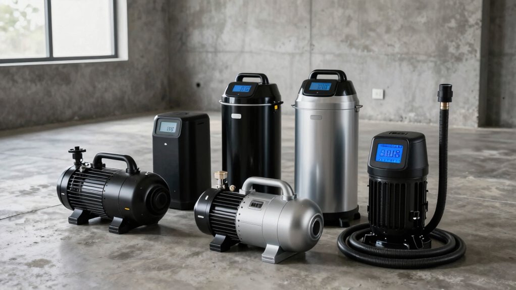 When choosing a sump pump for basement flooding, deciding between automatic and manual models is essential because each offers different levels of convenience and control. Automatic pumps activate and deactivate based on water level sensors, providing hands-free operation and reliable flood protection. They trigger at specific depths, like 1-1/5 inches, ensuring prompt responses to rising water. Manual pumps, on the other hand, require you to monitor water levels and turn them on or off manually. This gives you more control but demands constant attention; delays in activation can lead to flooding. Your choice depends on how much convenience you want and how often flooding occurs. If you prefer set-it-and-forget-it operation, automatic models are ideal. If you want maximum control, manual pumps might suit your needs better.