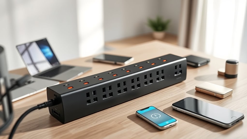 Surge protectors handle multiple devices at once by distributing power through multiple outlets, each with built-in surge protection. I make certain to choose a protector with enough outlets and a high joule rating to handle the total load. When I connect several devices, I check the surge protector’s capacity to ensure it can handle the combined power without risking overload or compromising protection. This keeps all my gadgets safe and functioning properly.