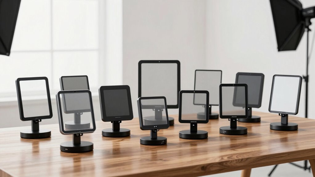 Portability and weight are key considerations when selecting a teleprompter for DSLR and mirrorless cameras, especially if you plan to shoot on location or move frequently between setups. Portable models under $800 typically weigh between 2 to 15 pounds, making them manageable for on-the-go filming. Lighter units often have foldable, compact designs that fit easily into backpacks or camera bags, enhancing mobility. Heavier teleprompters tend to offer more stable mounts but can be less convenient for frequent transport or outdoor shoots. Materials like aluminum and high-quality plastics are common in portable options, providing durability while keeping weight down. Keep in mind, the weight impacts setup time and ease of movement—especially important if you’re using handheld or tripod-mounted cameras.