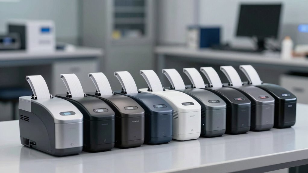 The ongoing cost of consumables like ribbons and labels plays a crucial role in choosing a thermal transfer printer under $2500. Ribbons typically cost between $10 and $50 per roll, with high-yield options capable of printing thousands of labels, lowering the cost per label over time. Different label types require specific ribbons—wax, resin, or blends—that vary in price and durability. Additionally, the availability and cost of compatible label media can considerably impact operating expenses. It’s important to weigh not just the initial purchase price but also the long-term costs tied to consumables. By evaluating ribbon longevity, media compatibility, and overall expenses, you can make a smarter, more cost-effective choice for your labeling needs.
