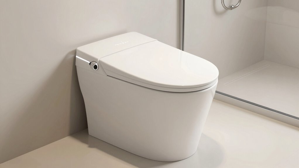 Choosing a toilet with a built-in bidet means paying attention to water efficiency standards to save both water and money. Most efficient models use no more than 1.28 gallons per flush (GPF), balancing performance with conservation. Dual-flush systems are especially useful, allowing you to choose a lighter flush (around 0.8 to 1.1 GPF) for liquid waste and a higher flush (about 1.6 GPF) for solids, optimizing water use. Toilets meeting WaterSense certification adhere to strict efficiency criteria, ensuring effective flushing while conserving water. Advanced features like tankless or siphonic jet flush systems are designed to reduce water consumption further without sacrificing cleaning power. Proper installation and upkeep are essential to maintaining these standards and preventing leaks or clogs that can waste water.
