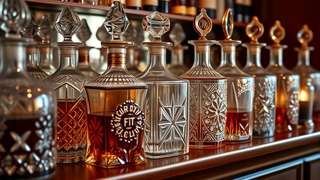 Personalization options can transform a whiskey decanter from a simple storage piece into a meaningful keepsake or gift. Engraving monograms, initials, names, or special dates adds a personal touch that makes the decanter unique. High-quality techniques like laser etching or diamond cutting guarantee the designs are detailed and durable, enhancing the overall look. Some decanters even offer space for messages or artwork on both sides, creating a truly custom presentation. While personalization can add to the cost, it’s well worth it for special occasions such as weddings, anniversaries, or milestone birthdays. These customized touches not only elevate the decanter’s aesthetic but also imbue it with sentimental value, making it a cherished addition to any home bar or a memorable gift.