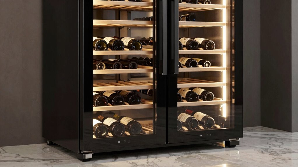 Dual zone refrigeration maintains different temperatures simultaneously by dividing the fridge into two separate compartments, each with its own cooling system. I love how this setup allows me to store red and white wines at their ideal temps without affecting each other. The independent thermometers and cooling units guarantee precise control, so I can enjoy my wines at the perfect temperatures, no matter what I’m serving or storing.