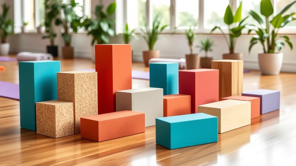 If you’re looking to elevate your yoga practice in 2025, I recommend exploring some of the top yoga blocks available. Options like cork and eco-friendly foam provide excellent support, stability, and durability, perfect for all skill levels and routines. Many blocks are lightweight, portable, and easy to maintain, making them versatile for various exercises. Keep an eye out for features like non-slip surfaces and ergonomic edges—further details could help you find the best fit for your needs.