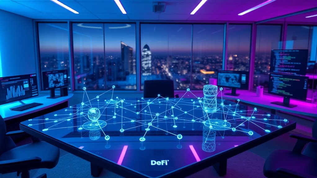 DeFi offers a more accessible and flexible alternative to traditional banking by enabling peer-to-peer lending and borrowing with cryptocurrency. You can participate directly without intermediaries, often benefiting from lower fees and faster transactions. As cryptocurrency adoption grows, DeFi platforms become more mainstream, giving you greater control over your finances. However, always remember the risks involved, like volatility and security issues, when compared to the stability of traditional banks.